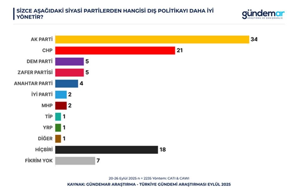 Katılımcılara yöneltilen “Siyasi partilerden hangisi dış politikayı daha yeterli yönetir?” sorusuna verilen cevaplarda AK Parti açık orta önde çıktı.