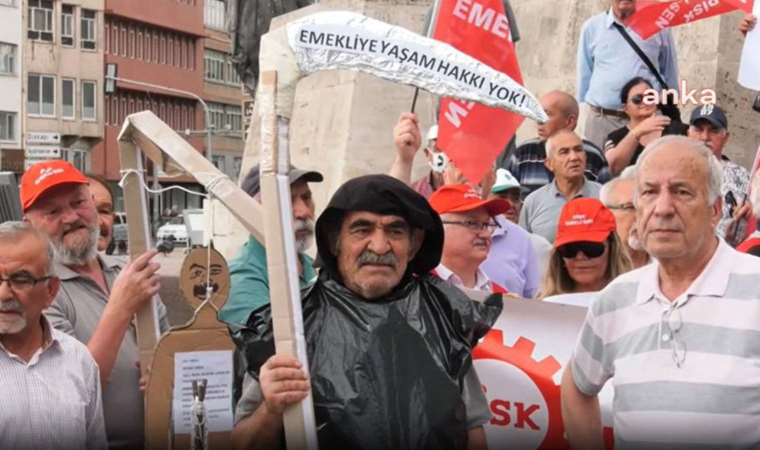 Eylemde, “Zam, zulüm, işkence, işte AKP”, “Emekliyiz, haklıyız, kazanacağız”, “AKP zamları al başına çal”, “Sefalet ücreti istemiyoruz” sloganları atıldı. Emekliler azrail sembolünün yanı sıra üzerinde “emekliler taş yesin” yazılı küçük tencelerlerle de minik bir gösteri sergledi.