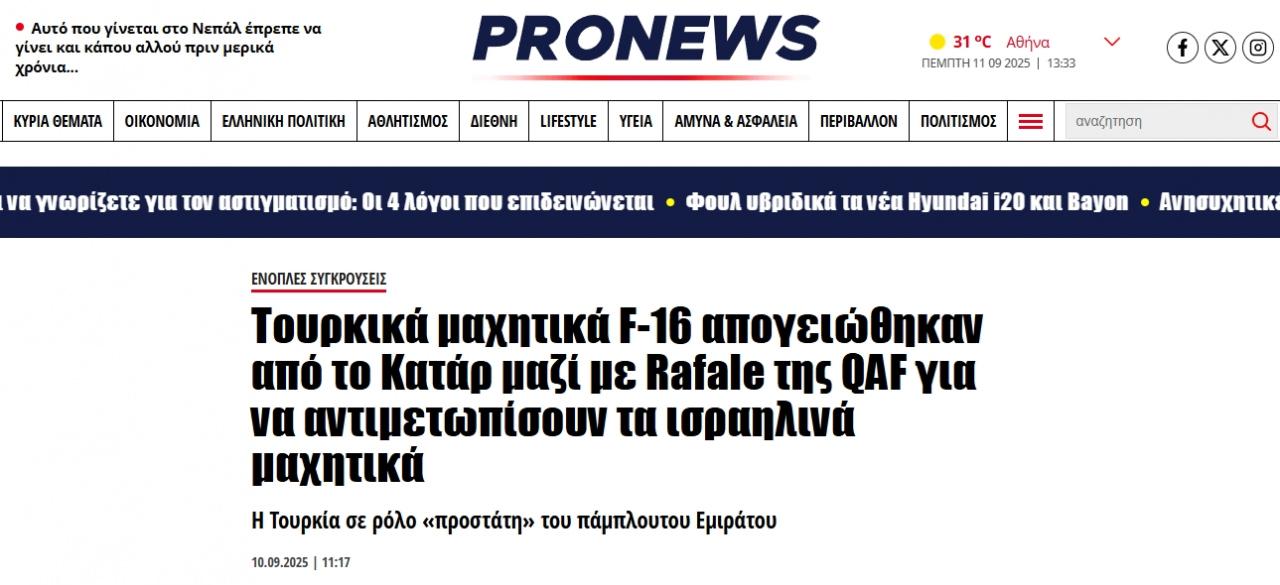 Yunanistan’da yayın yapan Pronews, Katar’da bulunan Türk üssünün İsrail’in havadan karaya füzelerini tespit ederek akının tesirini azalttığını belirtirken, Türk savaş uçaklarının da çabucak havalandığını tez etti. Pronews, Türk F-16 savaş uçaklarının hava saldırısının çabucak akabinde Katar’a ilişkin Rafale ve Eurofighter savaş uçaklarıyla birlikte kalkarak ortak misyon icra ettiğini ve ikinci bir İsrail saldırısını engellemek için havalandığını öne sürdü.