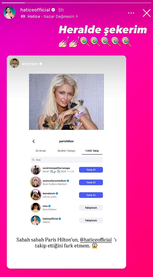 Fakat şöyle ki; dünyaca ünlü Paris Hilton’un ülkemizde her şeyden çok kombin seçimleriyle gündeme gelen müzikçi Hatice’yi takip ettiği fark edildi. Paris Hilton’un Instagram’da totalde 27 milyon takipçisi var ve kendisi yalnızca 7 bin 493 kişiyi takip ediyor.