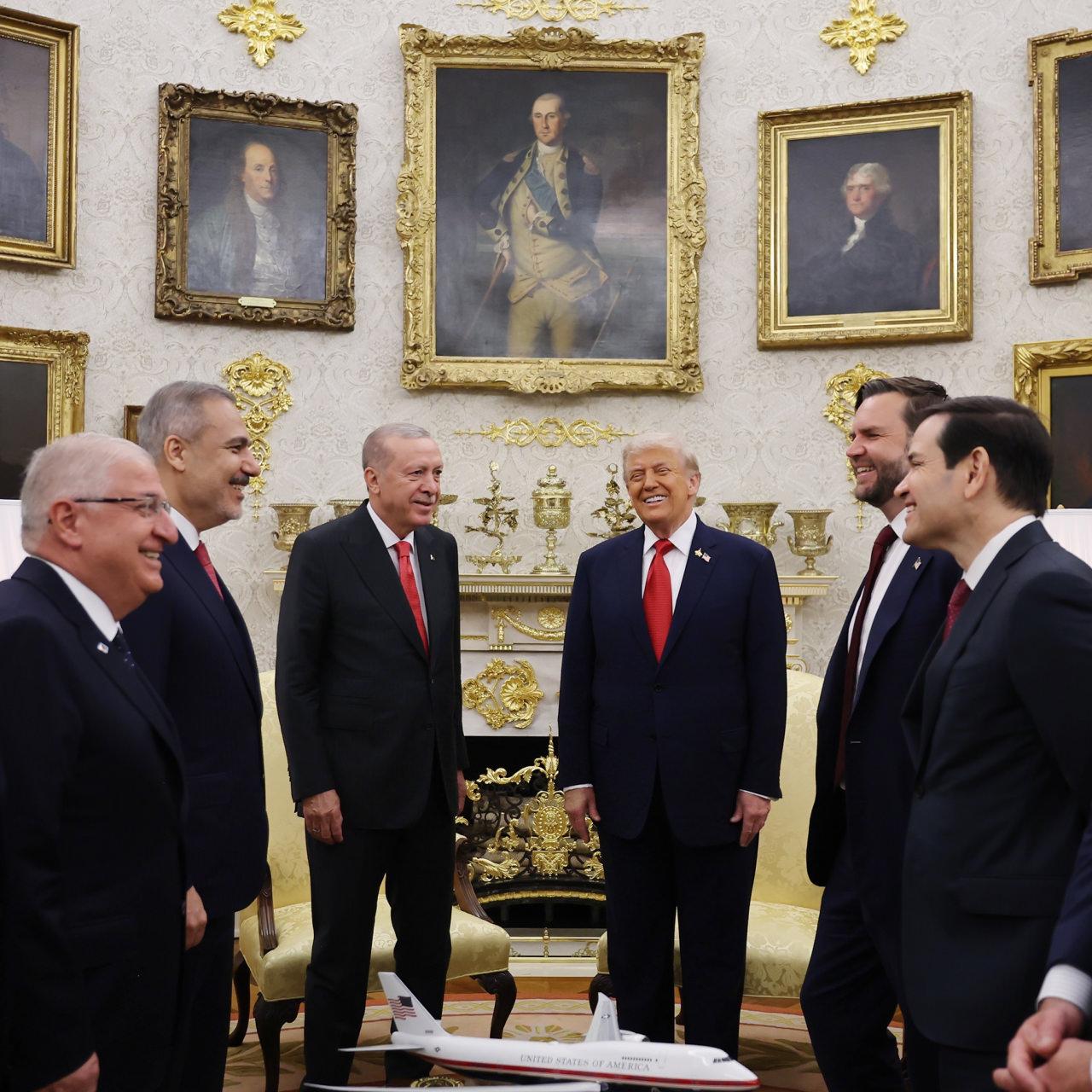 Oval Ofis’teki baş başa görüşmenin ve heyetler ortası öğlen yemeğinin ardından ABD Başkanı Trump, Cumhurbaşkanı Erdoğan’ı kapıya kadar geçirdi.
