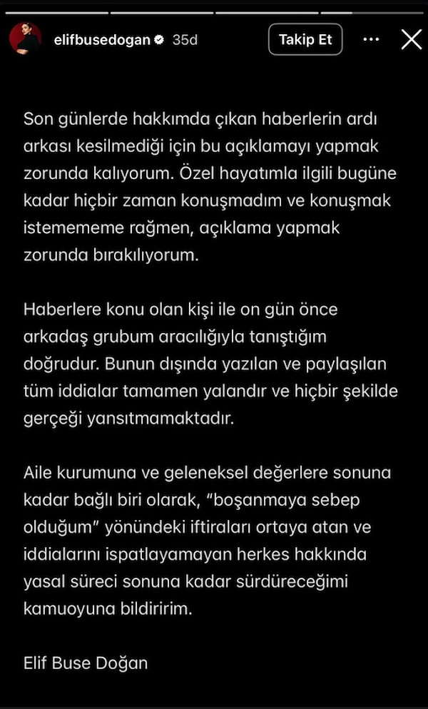Aile kurumuna ve klâsik pahalara sonuna kadar bağlı biri olarak, “boşanmaya sebep olduğum” istikametindeki iftiraları ortaya atan ve argümanlarını ispatlayamayan herkes hakkında yasal süreci sonuna kadar sürdüreceğimi kamuoyuna bildiririm.’