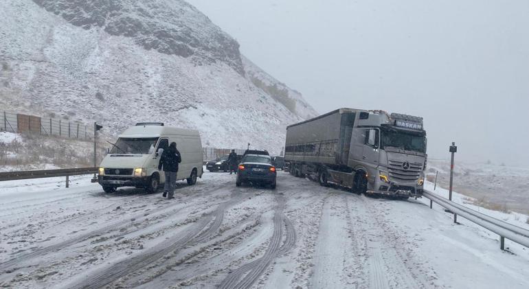 Erzincan-Sivas karayolunun yüksek kesitindeki Kızıldağ mevkiinde birdenbire bastıran kar yağışına hazırlıksız yakalanan araçlar, yolun trafiğe kapanmasına neden oldu.