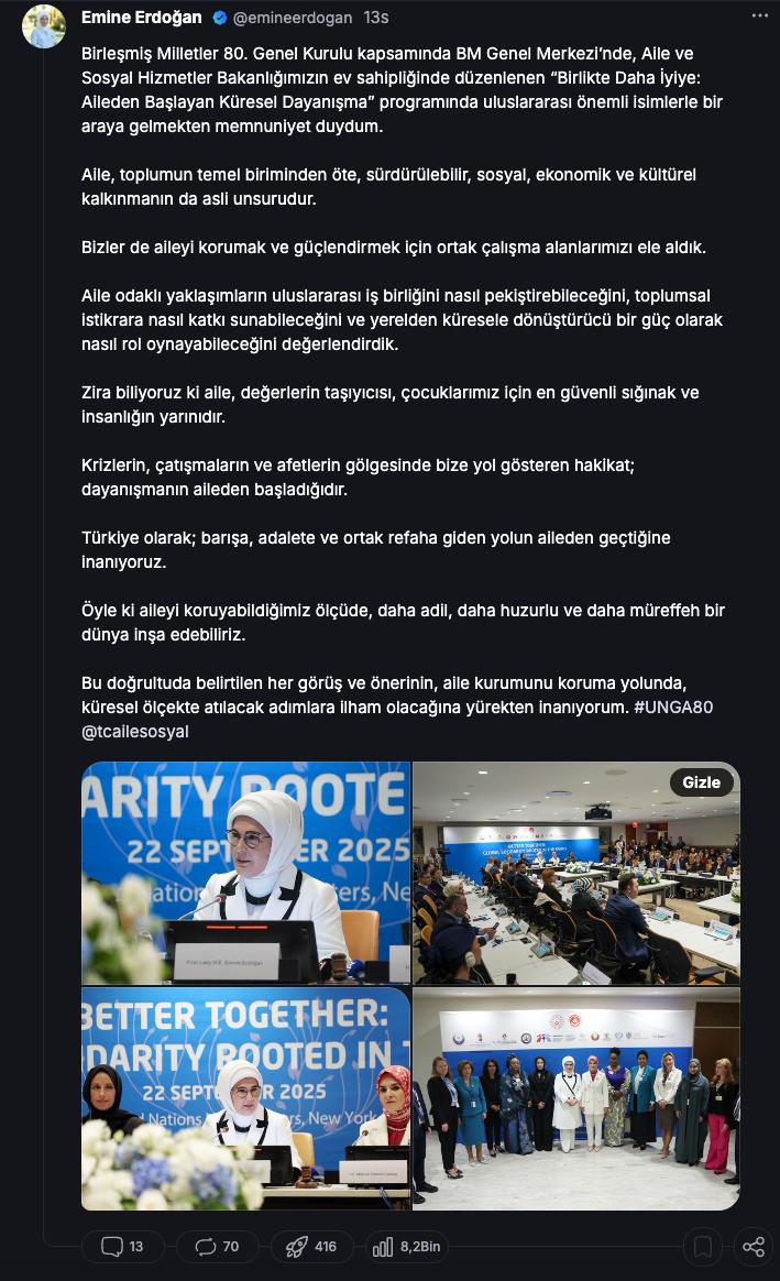 “Bizler de aileyi korumak ve güçlendirmek için ortak çalışma alanlarımızı ele aldık. Aile odaklı yaklaşımların milletlerarası işbirliğini nasıl pekiştirebileceğini, toplumsal istikrara nasıl katkı sunabileceğini ve yerelden globale dönüştürücü bir güç olarak nasıl rol oynayabileceğini değerlendirdik. Çünkü biliyoruz ki aile, bedellerin taşıyıcısı, çocuklarımız için en inançlı sığınak ve insanlığın yarınıdır. Krizlerin, çatışmaların ve afetlerin gölgesinde bize yol gösteren hakikat, dayanışmanın aileden başladığıdır. Türkiye olarak, barışa, adalete ve ortak refaha giden yolun aileden geçtiğine inanıyoruz. O denli ki aileyi koruyabildiğimiz ölçüde, daha adil, daha huzurlu ve daha müreffeh bir dünya inşa edebiliriz. Bu doğrultuda belirtilen her görüş ve teklifin, aile kurumunu muhafaza yolunda, global ölçekte atılacak adımlara ilham olacağına yürekten inanıyorum.”