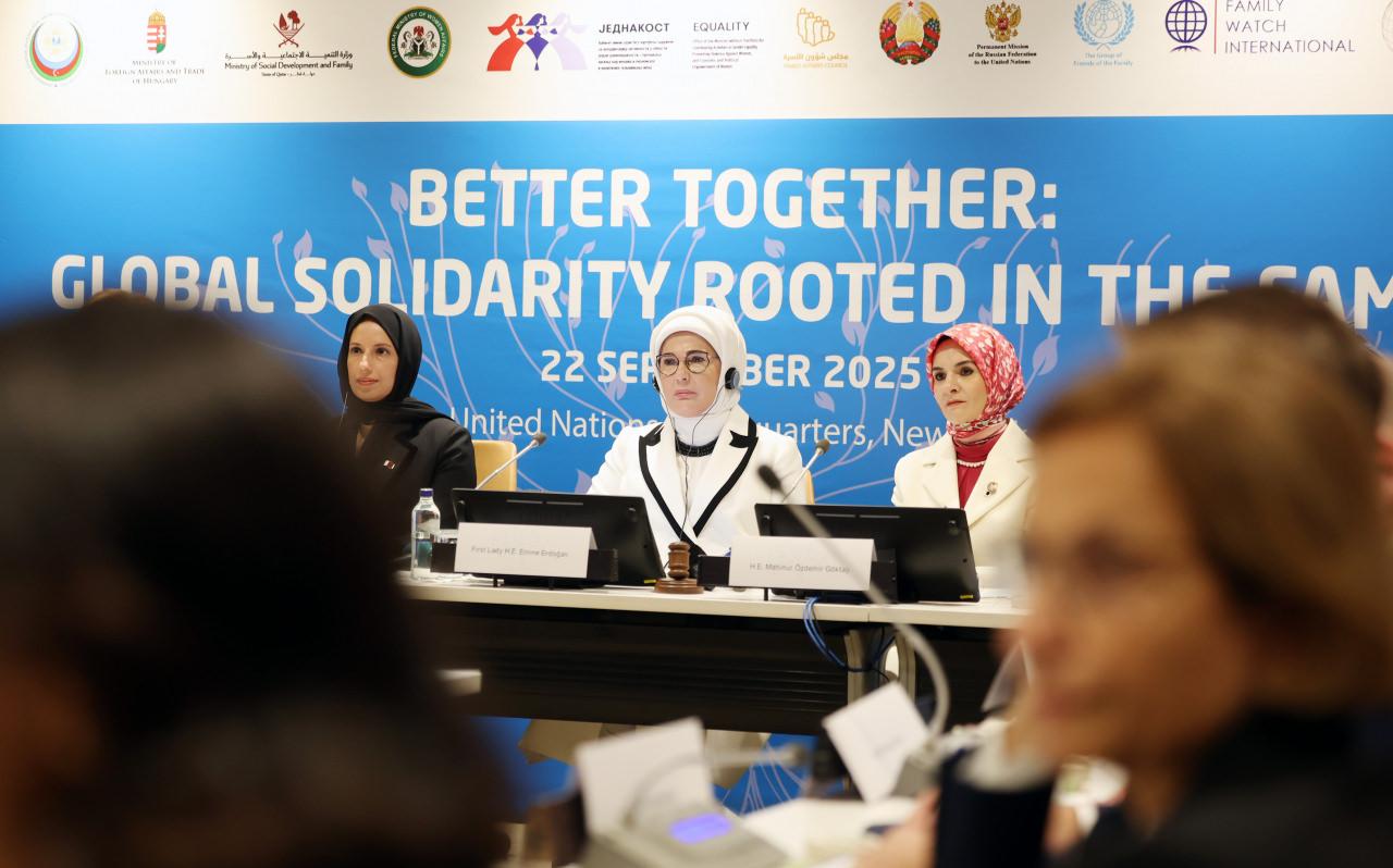 Emine Erdoğan, ailenin, sırf bir çatının altında yaşamak değil birlikte sevinmek, üzülmek ve direnmek olduğunu vurgulayarak “Türkiye olarak biz, barışa, adalete ve ortak refaha giden yolun aileden geçtiğine inanıyoruz. Memleketler arası siyasetlerde aile ögesini temel alan yaklaşımların, yerelden globale dönüştürücü bir güç oluşturacağını düşünüyoruz. Birleşmiş Milletler Aile Dostları Kümesi’nin da bir üyesi olarak, memleketler arası toplumun gündeminde, aileyi ön plana çıkarma teşebbüslerini her vakit destekledik, destekliyoruz. Lakin, bu teşebbüslerin daha da ilerletilmesini ve Birleşmiş Milletlerin, ailenin güçlendirilmesi konusunu, başlı başına bir siyaset olarak benimsemesi gerekiyor. Hatta bu bağlamda, Birleşmiş Milletler bünyesinde, ailenin güçlendirilmesine dair çalışmaları koordine edecek özel bir yapının kurulması hedeflenmelidir. Zira, ailenin yapısı ve niteliği, insanlığı bekleyen yarınların habercisidir.” ifadelerini kullandı.