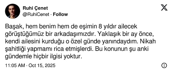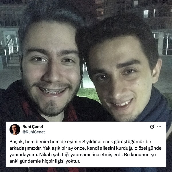 ‘Başak, hem benim hem de eşimin 8 yıldır ailecek görüştüğümüz bir arkadaşımızdır. Yaklaşık bir ay evvel, kendi ailesini kurduğu o özel günde yanındaydım. Nikah şahitliği yapmamı rica etmişlerdi. Bu bahsin şu anki gündemle hiçbir ilgisi yoktur.’ açıklamasında bulundu.