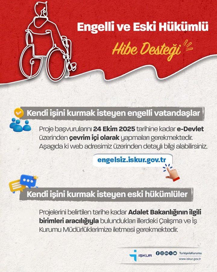 Bakan Işıkhan, hibe desteğiyle kişilerin “kendi işini kurmak, mesleksel eğitim ve rehabilitasyon kursları ve dayanak teknolojileri” üzere projelerden faydalanabileceğini belirtti.