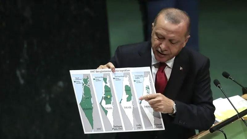 Cumhurbaşkanı Erdoğan, 1947’den bu yana Filistin haritasındaki değişimi anlatan görselle Filistin meselesine işaret ederek şu değerlendirmelerde bulundu: