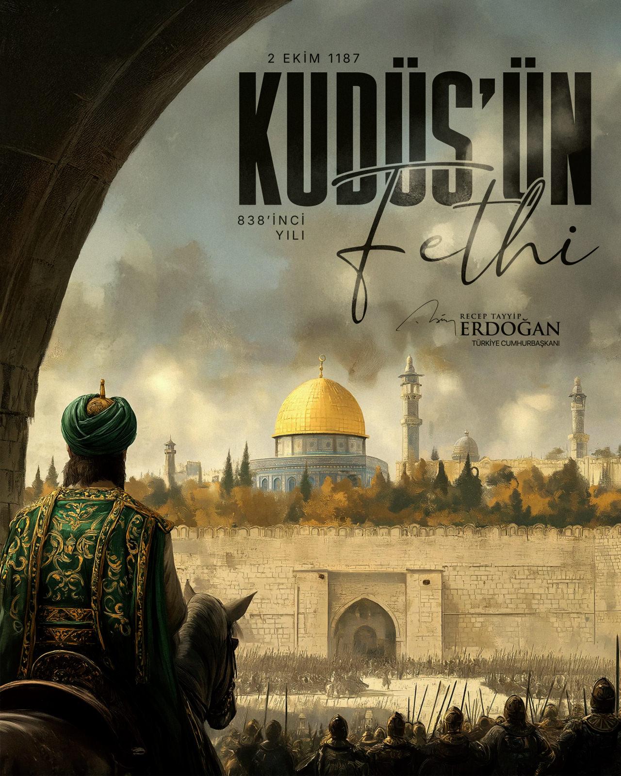 Cumhurbaşkanı Recep Tayyip Erdoğan, Kudüs’ün fethinin 838’inci yıl dönümünde, bu kutsal kentin ikinci fatihi Selahaddin Eyyubi ve kahraman askerlerini rahmetle yad ettiğini belirtti.