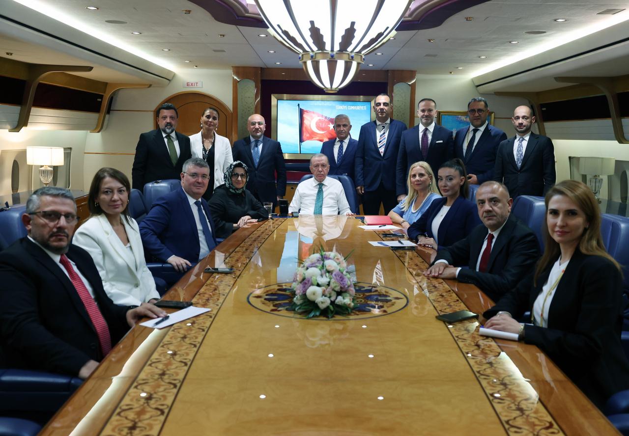 Zirve’de konuşma yapan Cumhurbaşkanı Erdoğan, Türkiye’ye dönerken ortalarında Kanal7 Genel Yayın Yönetmeni Mehmet Acet’in de yer aldığı gazetecilerin sorularını yanıtladı.