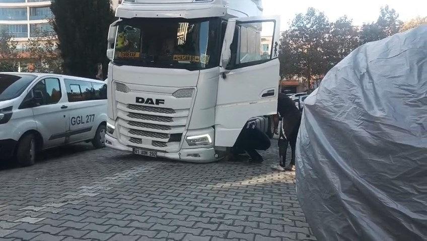 İstanbul Esenyurt’ta Mehter Çeşme Mahallesi 2007 Sokak’ta seyir halinde ilerleyen dorsesiz TIR çekicisinin ön lastiği kilit taşlı yola saplandı. Sürücü ve etraftakiler aracın lastiğini bulunduğu yerden çıkarmaya çalıştı.