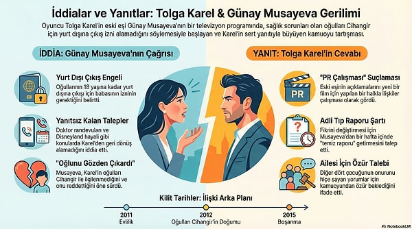 Günay Musayeva’nın katıldığı programda anlattıkları, Tolga Karel’i yine magazin gündeminin tam ortasına taşıdı. Musayeva, sıhhat problemleri olan oğulları Cihangir için yurt dışına çıkışta 18 yaşına kadar babadan izin belgesi gerektiğini, bu yüzden yıllardır problem yaşadıklarını ve bilhassa doktor randevusu ile Disneyland hayali üzere bahislerde Karel’den geri dönüş alamadıklarını söyledi.