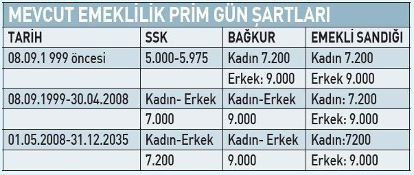 Emekli Sandığı’nda ise bayanlar 7200 gün (20 yıl) erkekler ise 9 bin gün (25 yıl) prim ödüyor. Bağ-Kurlular için ise prim kuralları 8 Eylül 1999 öncesinde bayanlarda 7200 gün erkeklerde 9 bin gün, sonrasında ise hem bayan hem erkeklerde 9 bin gün (25 yıl) olarak uygulanıyor.