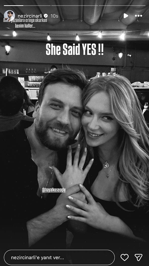 Oyuncu Hayal Köseoğlu, yeni yaşına hayatının en özel sürpriziyle girdi. Bir müddettir meslektaşı Nezir Çınarlı ile aşk yaşayan Köseoğlu, doğum gününde romantik bir evlilik teklifi aldı. Hoş oyuncu, bu manalı teklife ‘Evet’ karşılığını verirken memnun anlarını da toplumsal medya hesabından paylaşmayı ihmal etmedi. 💍
