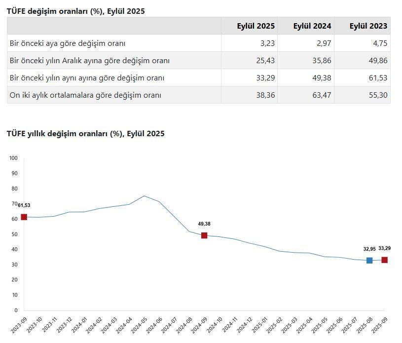 Buna nazaran, tüketici fiyatları 2025 yılı Eylül ayında bir evvelki aya nazaran yüzde 3,23, bir evvelki yılın aralık ayına nazaran yüzde 25,43, bir evvelki yılın birebir ayına nazaran yüzde 33,29 ve 12 aylık ortalamalara nazaran yüzde 38,36 arttı.