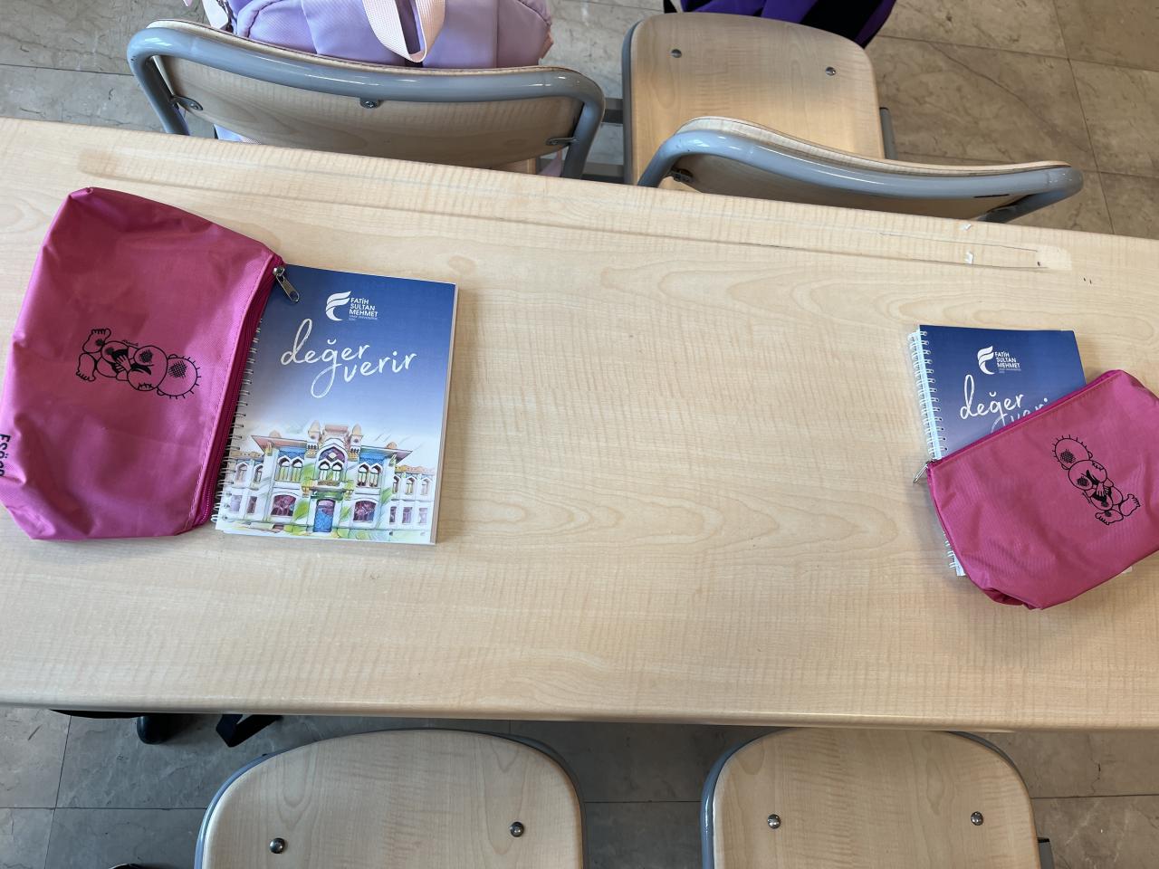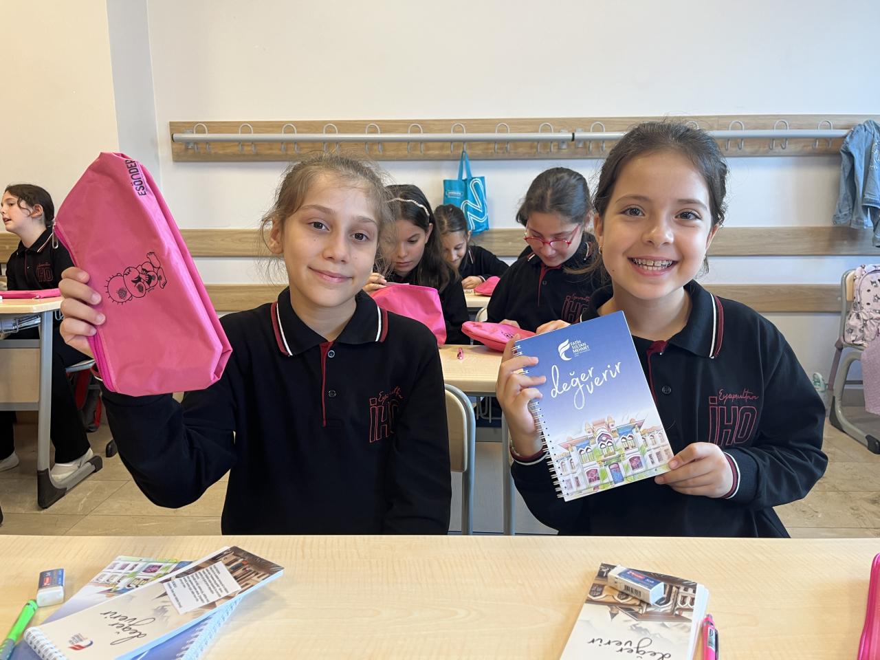Eğitime başlayan öğrenciler, sıralarının üzerinde buldukları kalemlikleri, içindeki sürpriz notu ve kırtasiye materyallerini görünce şaşırdı.