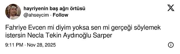 Bu sahne, Fahriye Evcen’in mesleğinde değerli bir yer tutan Yaprak Dökümü dizisini ve oradaki Necla karakterini de yine gündeme taşıdı. Dizide Necla Tekin rolüyle geniş kitlelere ulaşan Evcen, zati son yıllarda paylaşımlarında sık sık “Tam Yaprak Dökümü’ndeki Necla olmuşsun” yorumları alıyordu; bu görüntüye da benzeri yorumlar gecikmedi…