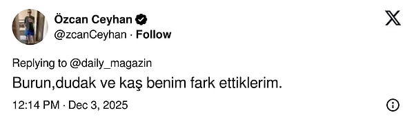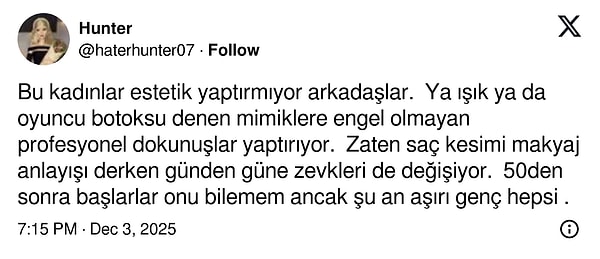Evcen yalnızca projeleriyle, özel hayatıyla değil, hoşluğuyla de sık sık magazin gündemine oturuyor. Hakkında yıllardır süren ‘estetik’ argümanlarına karşın ünlü oyuncu her seferinde makyajsız halini paylaşarak adeta ‘Hiç süreç yok’ diyerek söylentileri reddediyor.