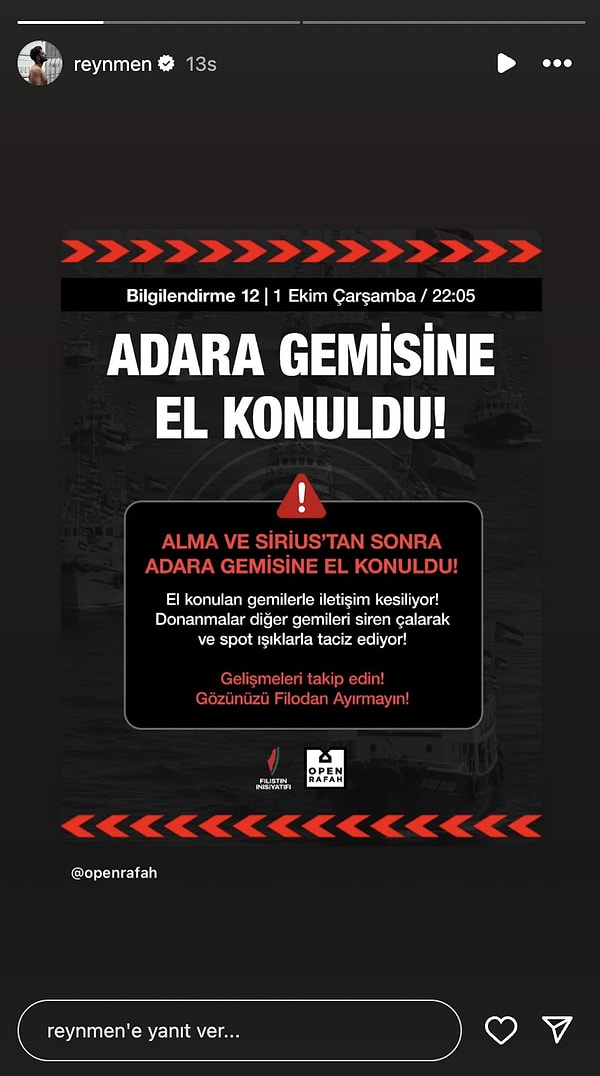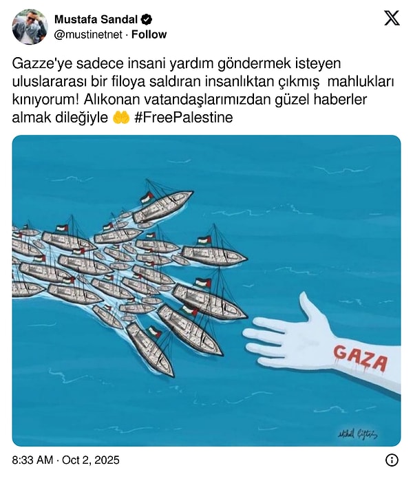 İnsani yardım ulaştırmak emeliyle Gazze’ye yanlışsız yol alan Global Sumud Filosu bir evvelki gün taarruza uğradı. İsrail komandoları gemilere çıkarak aktivistleri gözaltına aldı. Toplumsal medyada ise reaksiyonlar çığ üzere büyüdü. Ortalarında Mustafa Sandal, Sıla Türkoğlu, Gülben Ergen ve Murat Yıldırım’ın da bulunduğu çok sayıda ünlü isim Filistin’e dayanak iletileri paylaştı.