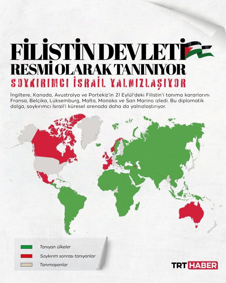 Bu tablo, Batı’nın da giderek Filistin’in devlet statüsünü kabul etmeye başladığını ve katil İsrail’in diplomatik hareket alanını kaybettiğini ortaya koyuyor.