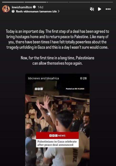 Formula 1’de 7 kere dünya şampiyonu olan Lewis Hamilton, toplumsal medya hesabından Filistin paylaşımı yaptı.