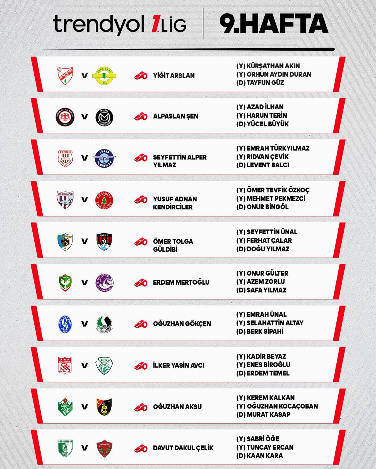 Diğer taraftan MHK’nın gönderisinde, 9. haftada oynanacak öbür müsabakaları yönetecek hakemlere de yer verildi. Liste şu biçimde: