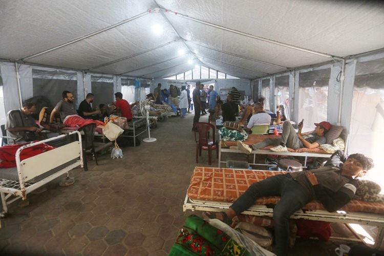 Bina içinde ise koridorlar, merdiven başları dahil olmak üzere yatak koyulabilecek her yerde yatak olduğu ve bunlarda da bir değil birkaç Filistinlinin yattığı görülüyor. Bina içinde kendilerine yer bulamayan hastalar ise bir nevi dışarı taşmış durumda. Onlar için de hastane avlusunda kurulan çadırda hizmet veriliyor. Hastaların birçoklarının yerde sünger yataklarda yatması dikkati çekiyor. Bu durum, hastaların hayatını tehdit ediyor.