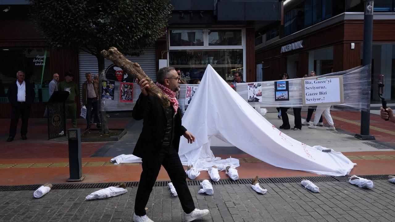 Artvin Çoruh Üniversitesi Görsel İrtibat Tasarımı Kısmı Öğretim Üyesi Dr. Kemal Sağlam, Gazze’de yaşanan katliamlara dikkat çekmek hedefiyle Trabzon’un Kahramanmaraş Caddesi’nde bir protesto gerçekleştirdi. Caddede bulunan ağaç ve aydınlatma direğinin ortasına streç sinema gererek öğrencilerinin Gazze’de yaşananlarla ilgili yaptığı görsel çalışmaları sergileyen Sağlam, fotoğraflarında sivillerin ve çadırların bombalandığı iletilerini verdi. Bir çadır kurarak temsili kefene sardığı odun kesimlerini yere dizen Sağlam, “Odunlar uyanın; Gazze’de bebekler ölüyor, insanlık ölüyor” diyerek slogan attı.