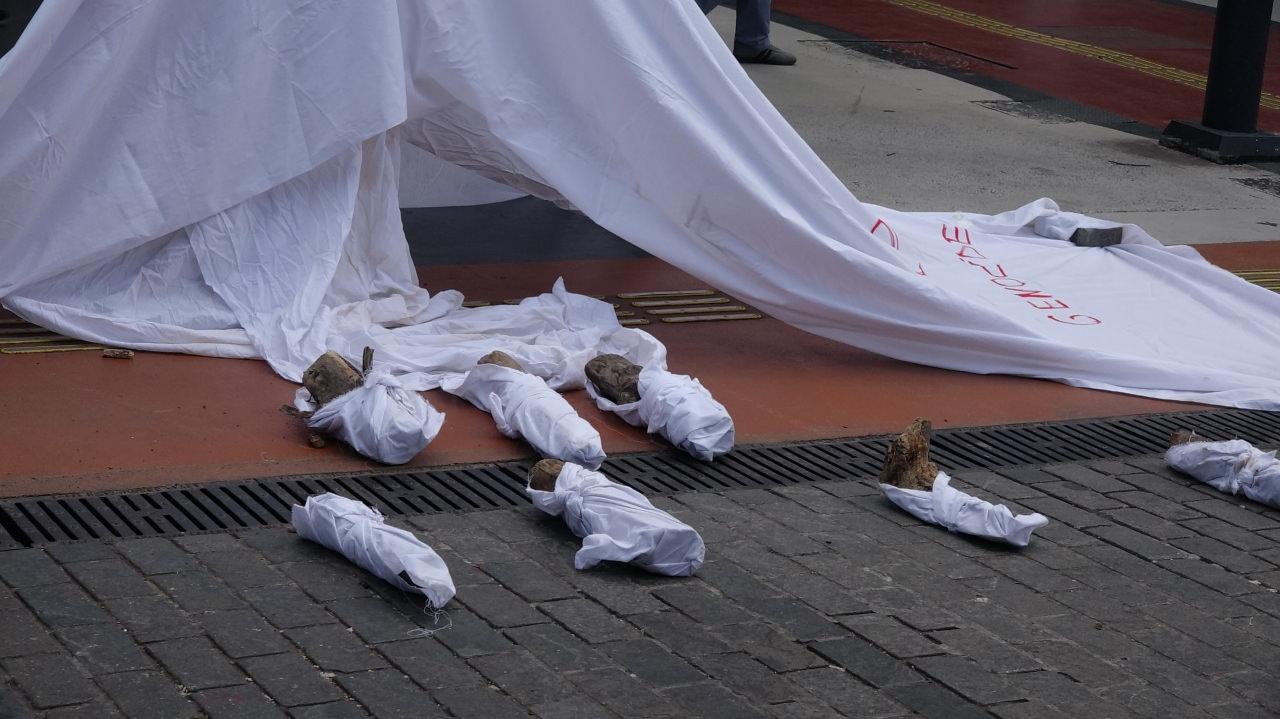 Kefene sarılmış odundan bebeklerle duyarsızlığı anlatmak istediğine dikkat çeken Sağlam, “Kundağa sardığım odunlar ile bebeleri simgeleyip, duyarsız insanların da bir gün bebeklerinin ölebileceğini anlatmak istedim. Gazze’de bebekler öldü. Bu duruma reaksiyon göstermek istedim. Beşerler çadırlarda bile yaşayamıyor. Kuzeyden güneye güneyden kuzeye göç ediyorlar. Beşerler açlıktan ve susuzluktan ölüyor. 21’inci yüzyılın sonunda bu türlü bir şeyin olması gerçek değil. Yazılan akademik tezler ve makaleler insanları yola getirmedi. Bu türlü büyük bir katliama insanların seyirci kalması yanlışsız değil. İnsanların vicdanı, merhameti ve Gazze’de ölen düzgünlüğü kurtarmak için harekete geçmesi gerekiyor” diye konuştu