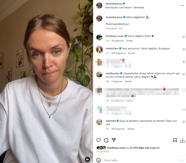 “Dünyanın her yerinde özellikle bu ülkede birçok kadının maruz kaldığı aile içi psikolojik ve ekonomik şiddetin çok kötü bir örneğini yaşıyorum. Bu makyaj için imkanları kısıtlı çünkü 50 gündür kişisel eşyalarıma ve gözüm gibi baktığım engelli kedilerime ulaşamıyorum. Bir insanı felaketten çıkmış gibi bırakmak safi kötülüğün bir göstergesi. Hayatım boyunca he iyilikle, canlara dokunmaktan beslendim. Ben kadın hakları için ailemi bile karşıma aldım. Unutmayın ki yaşanan hiçbir şey sizinle ilgili değil, sadece şanssız bir zaman diliminde çok kötü insanlara denk geldiniz. Bir yerlerde susmak zorunda olduğunuzu biliyorum. Yalnız değilsiniz, susmayın!”