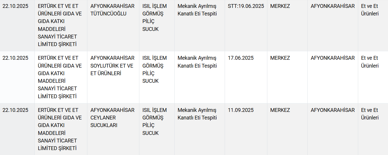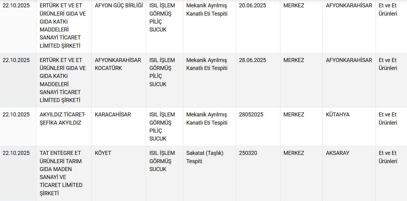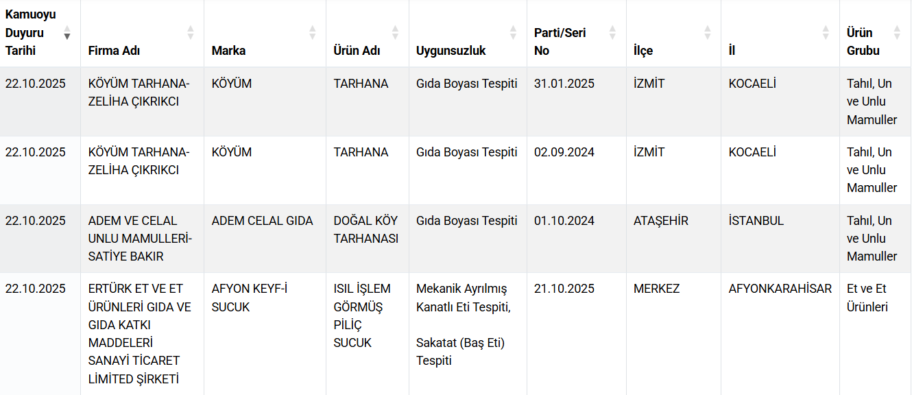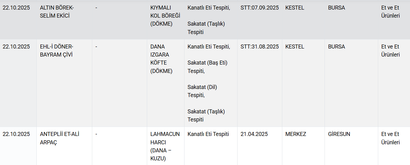Ekonomim’in haberine nazaran, son yapılan testlerde, dana köfte, kıymalı börek ve sucuk imalinde sakatat, baharatta yasaklı boya, tarhanada ise besin boyası kullanımı tespit edildi.