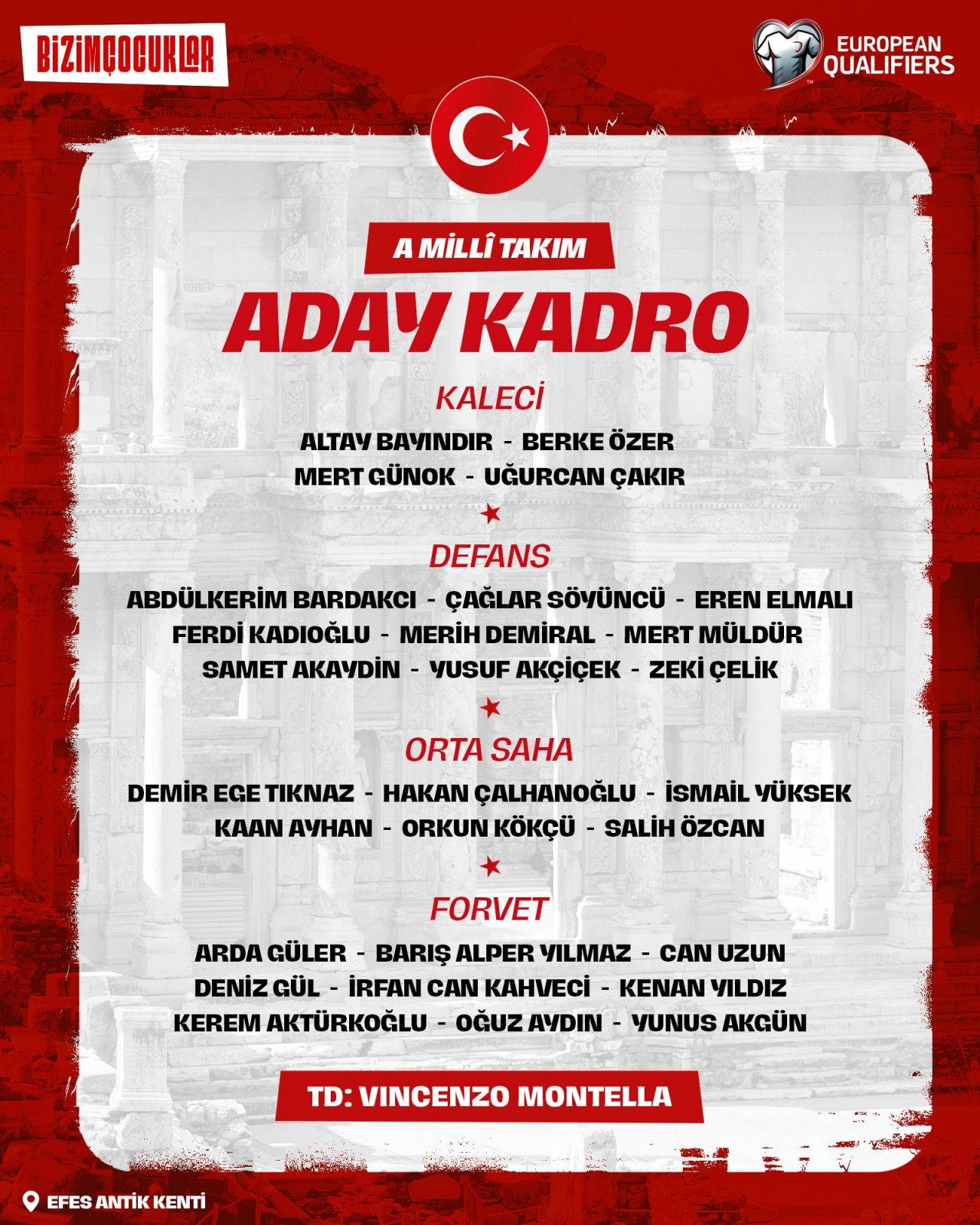 TÜRKİYE: Uğurcan Çakır, Mert Müldür, Merih Demiral, Abdülkerim Bardakcı, Eren Elmalı, Hakan Çalhanoğlu, Orkun Kökçü, Arda Güler, Yunus Akgün, Kenan Yıldız, Kerem Aktürkoğlu.