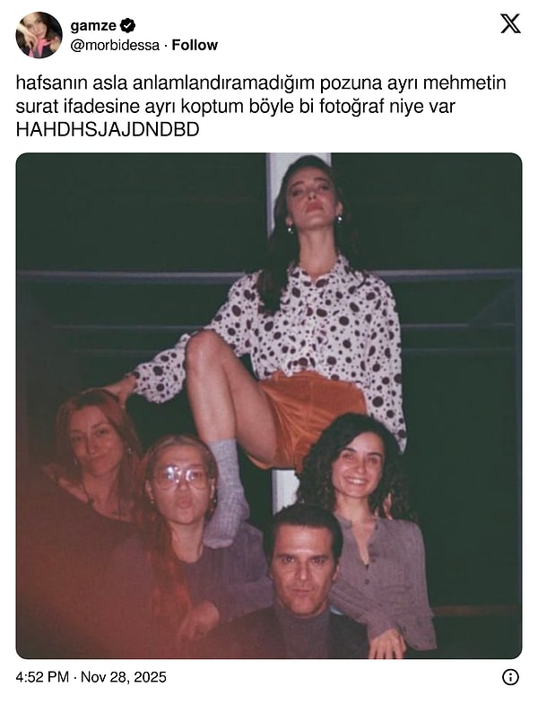 NOW’un tezli dizilerinden Kıskanmak setinden gelen bir kare toplumsal medyayı karıştırdı. Dizinin Mükerrem’i Hafsanur Sancaktutan, rol arkadaşı Mehmet Günsür ve öbür takım arkadaşlarıyla verdiği pozla gündeme oturdu. Pozdaki rahat ve eğlenceli hali dikkat çeken Sancaktutan’ın bir ayağını arkadaşının omzuna koyduğu ve bir elini de diğer bir arkadaşının başına yerleştirdiği anlar toplumsal medya kullanıcılarının lisanına düştü.