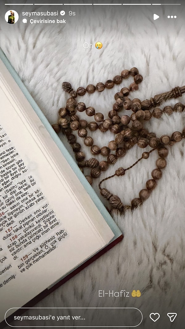 Ünlü fenomen, toplumsal medya hesabından Kur’an-ı Kerim ve tespih fotoğrafı paylaştı. Paylaşımda Kur’an-ı Kerim sayfalarının ve tespihin yer aldığı görülürken, Subaşı gönderisine “Oh” ve “El Hafız” notlarını düştü. Bu paylaşım, kısa müddette toplumsal medyada dikkat çekti.