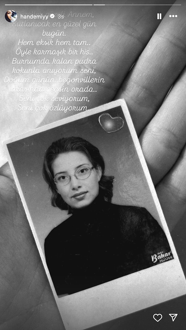 ‘Güzeller hoşu annem, kutlanacak en hoş gün bugün. Hem eksik hem tam… O denli karmaşık bir his… Burnumda kalan pudra kokunla anıyorum seni, doğum günün begonvillerin ortasında geçsin orada. Seni çok seviyorum, seni çok özlüyorum’ tabirlerini kullandı.