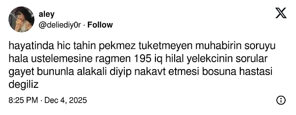 Manifest cephesinde “Amatör” dönüşü yalnızca müzikle değil, basın alanındaki anlarla da konuşulmaya devam ediyor. Yasal süreç hakkında konuşmak istemediklerini net halde belirtmelerine karşın tıpkı sorunun ısrarla yöneltilmesi hayranları kızdırırken, sahnenin en takdir toplayan cevap Hilal Yelekçi’den geldi.