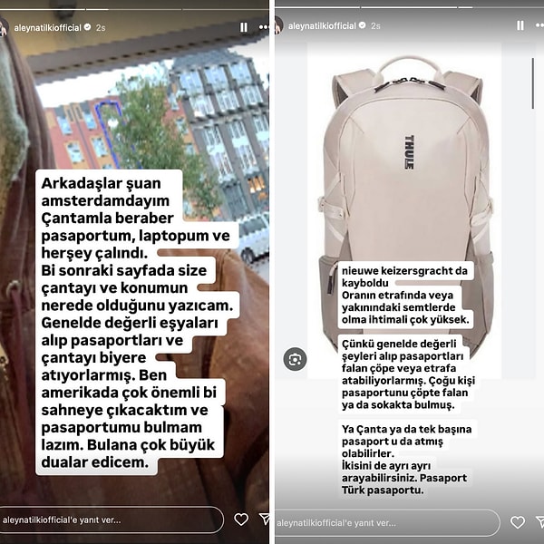‘Amerika’da çok kıymetli bir sahneye çıkacaktım ve pasaportumu bulmam lazım. Bulana çok büyük dualar edeceğim’ dedi. Bir sonraki öyküsünde de çantasının modelini ve çantasının çalındığı pozisyonu paylaştı.