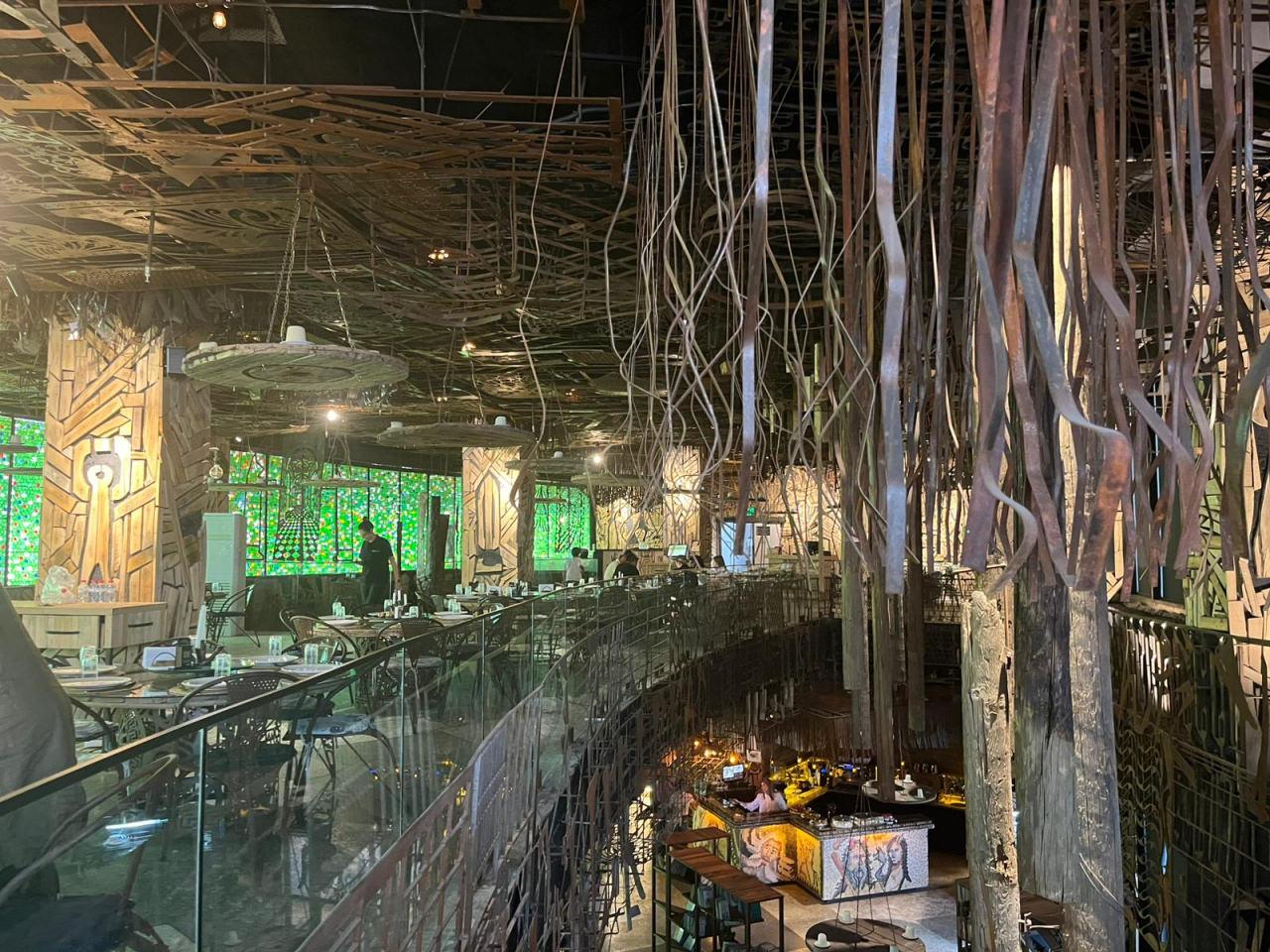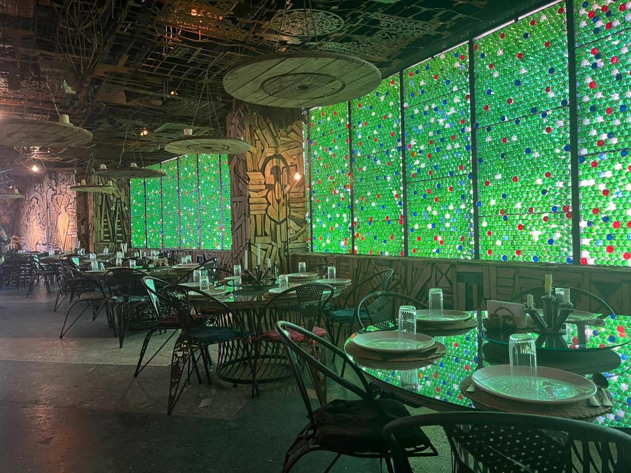 Duvarlardaki süslemelerin ekmekçiler ve mobilyacılardan kalma ahşap atıklarla sanata dönüştürülmesiyle kafe eşsiz bir görünüme ulaştırıldı.