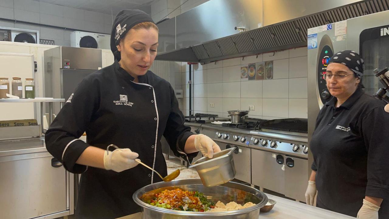 Mutfak Şefi Esra Göğüş, “Sıfır atık yemeği Omaç Gaziantep’in savaş devrinde kıtlık vaktinde ortaya çıkan bir yemeğimiz. Mesken ekmeklerinin dökülen taneleriyle konutumuzda olan domates, maydanoz, soğan ne varsa birleştirilip yapılır. Çok da hoş bir yemektir” diyerek geri dönüşüm yemeğini hazırladı.
