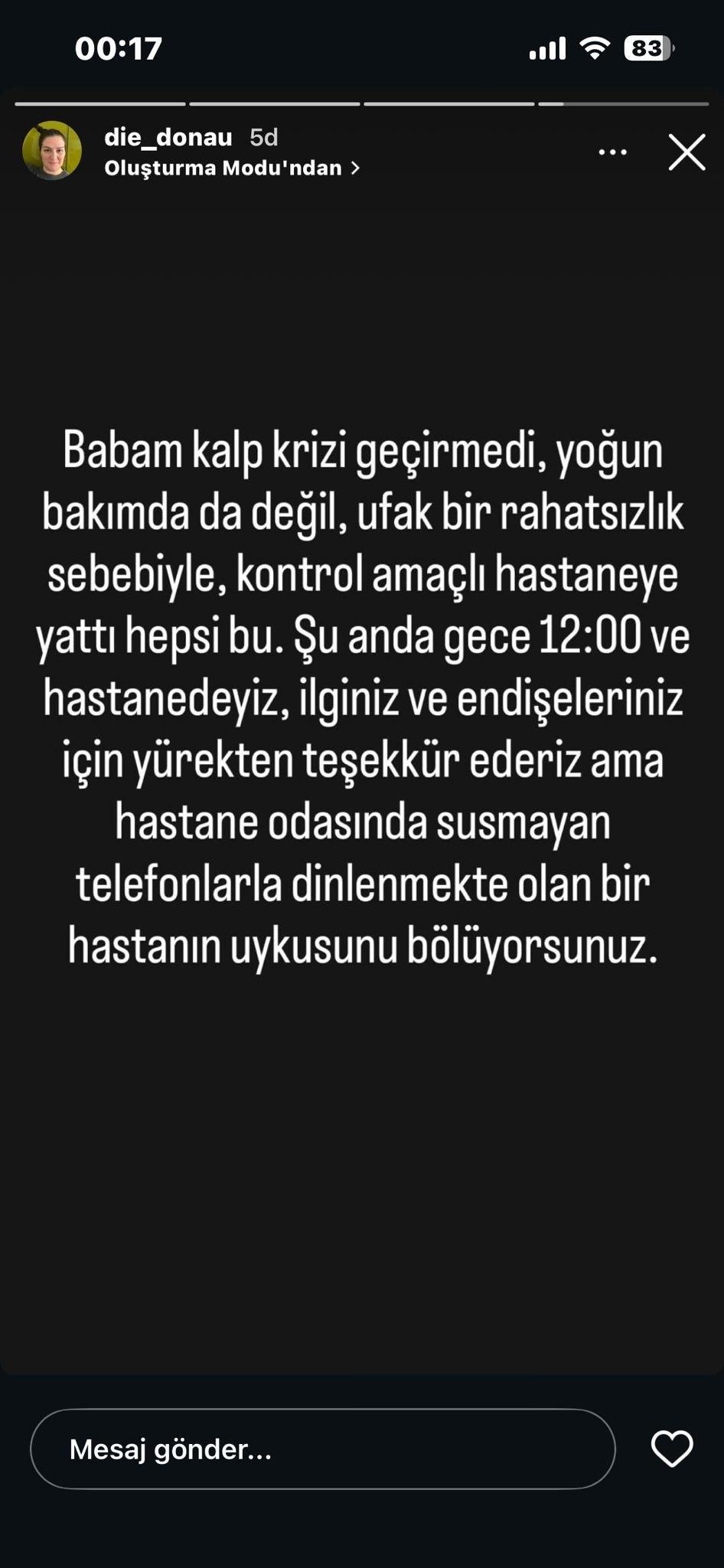 “Babam kalp krizi geçirmedi, ağır bakımda da değil, ufak bir rahatsızlık sebebiyle, denetim hedefli hastaneye yattı hepsi bu. Şu anda gece 12:00 ve hastanedeyiz, ilginiz ve tasalarınız için yürekten teşekkür ederiz lakin hastane odasında susmayan telefonlarla dinlenmekte olan bir hastanın uykusunu bölüyorsunuz.”