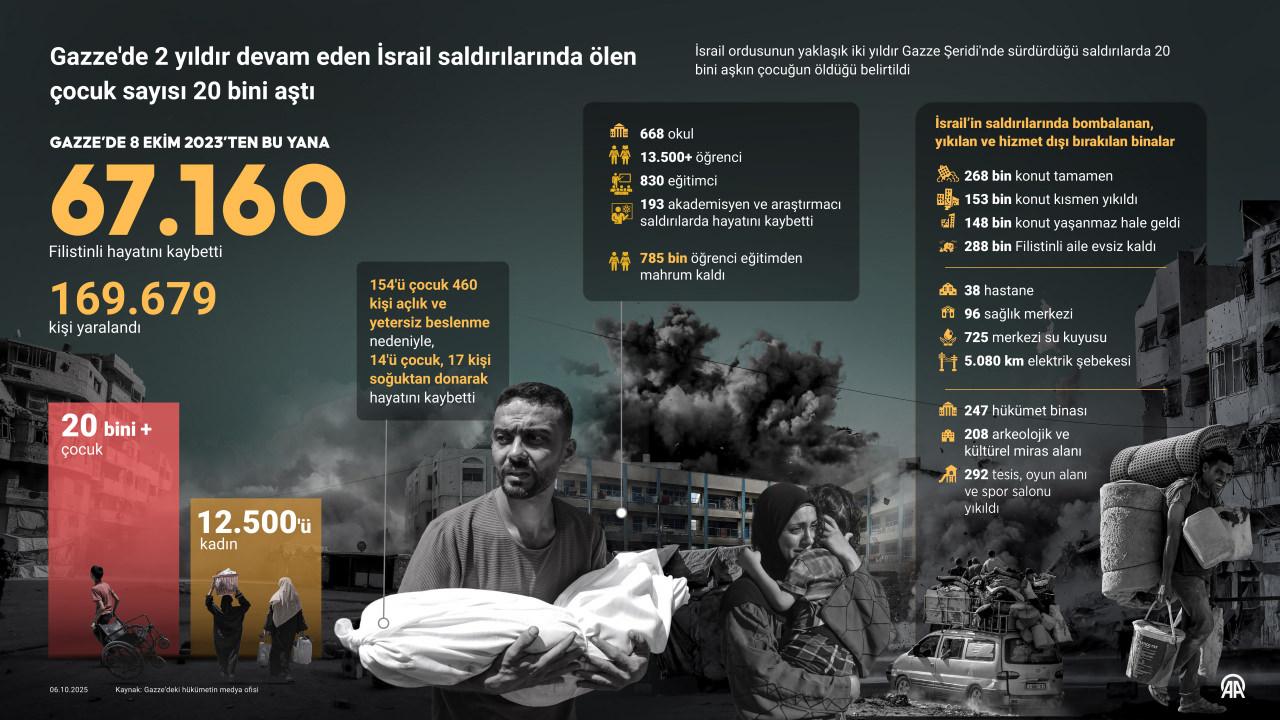 İsrail ordusunun Gazze Şeridi’nde 8 Ekim 2023’ten bu yana sürdürdüğü soykırımda hayatını yitirenlerin sayısı son 24 saatte 21 artarak 67 bin 160’a yükseldi.