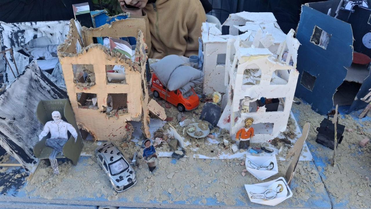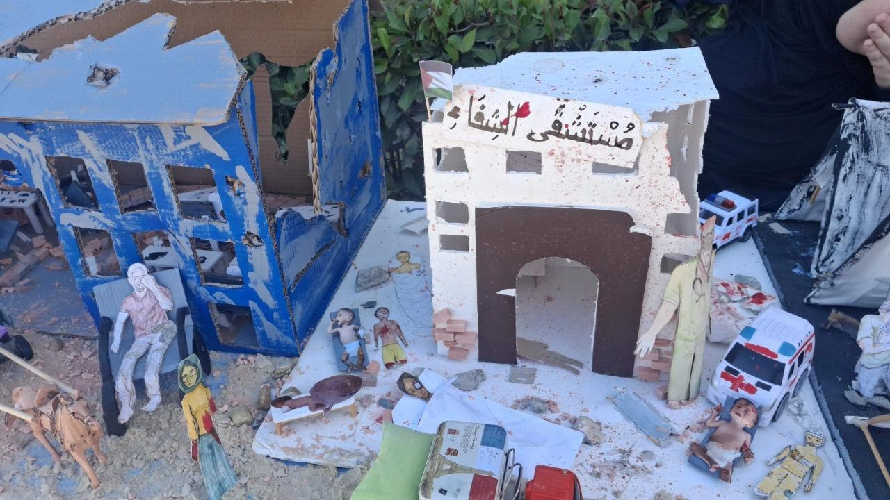 Bombalanmış bir okulu canlandıran bir alanda da devrilmiş sıralar ve masalar üzerinde yanmış, etrafa saçılmış kitap ve defterlerden oluşan bir ortam sahnelendi. Bir öteki alanda da öğrenciler ablukayı kıran gemilerin aksaya ulaştığı fotoğrafları orada yaptı.