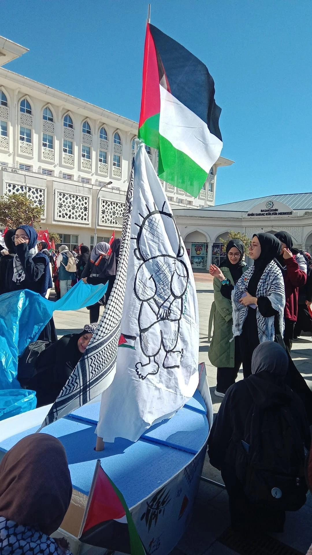 Yürüyüş boyunca “Nehirden denize özgür Filistin”, “İstanbul’dan Gazze’ye direnişe bin selam”,“Katil İsrail, Filistin’den defol”, “Katil Amerika Ortadoğu’dan defol”, “Yaşasın Ümmet dayanışması, yaşasın Filistin mücadelemiz” üzere sloganlar atılan yürüyüşte öğrenciler ellerinde İsrail ordusu tarafından katledilen Ayşenur Ezgi, Rachell Corrie, Ahmet Manasra, Rim, Doktor Hüsam, tanka taş atan çocuk üzere fotoğrafları taşıdılar.