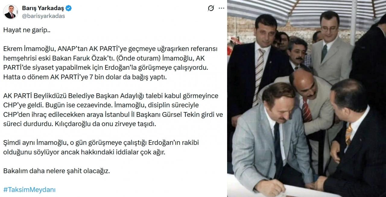 CHP’li Barış Yarkadaş, Ekrem İmamoğlu’nun, Lider Erdoğan ile birebir karede yer aldığı bir arşiv fotoğrafını da yayınladı.