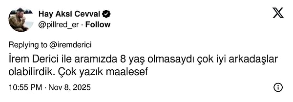 Kendisi hem ünlü isimlerle hem toplumsal medya kullanıcılarıyla tartışmaya girmekten çekinmiyor. Ortalığın karışmasına sebep olan tweet’te bir kullanıcı, ortalarında yaş farkı olmasa İrem Derici ile arkadaş olabileceklerini yazmıştı.