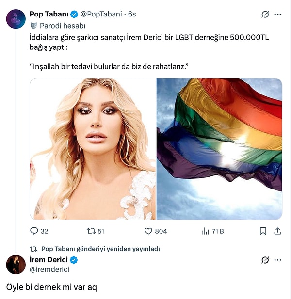 ‘İddialara nazaran müzikçi sanatçı İrem Derici bir LGBT derneğine 500.000TL bağış yaptı: “İnşallah bir tedavi bulurlar da biz de rahatlarız.” ‘ formundaki habere ‘Öyle bi dernek mi var?’ yorumunda bulunan İrem Derici yorumuyla gündeme oturdu!