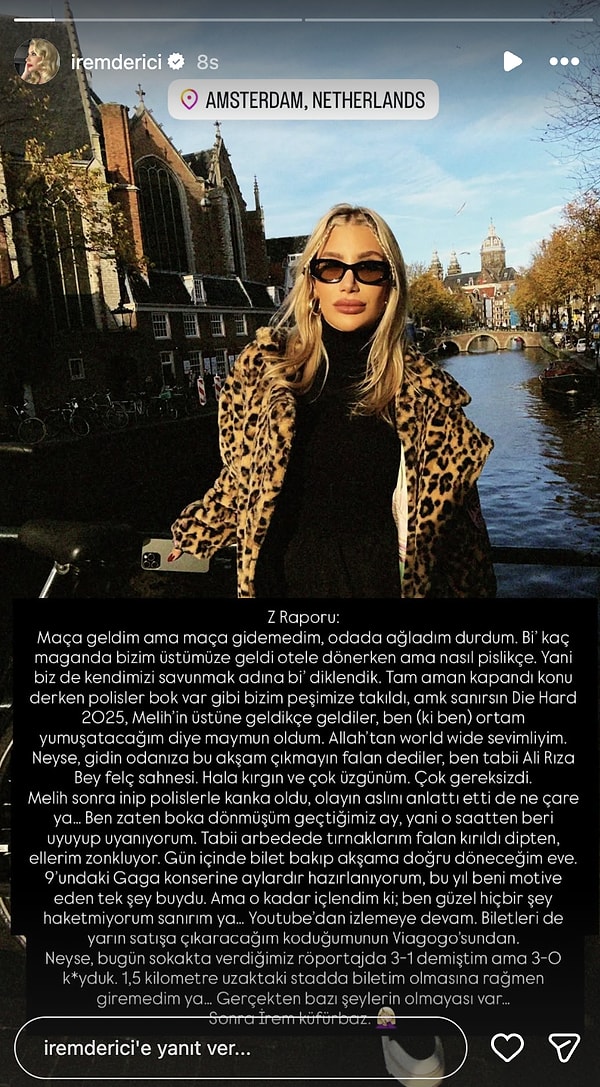 “Maça geldim lakin maça gidemedim, odada ağladım durdum. Birkaç maganda bizim üstümüze geldi otele dönerken fakat nasıl pislikçe. Biz de kendimizi savunmak ismine diklendik, tam ‘konu kapandı’ derken bu kere polisler peşimize takıldı. Melih’in üstüne geldikçe geldiler, ben ortam yumuşatıcı oldum resmen. Allah’tan world wide sevimliyim! Neyse, ‘Gidin odanıza, bu akşam çıkmayın’ falan dediler. Ben tabi Ali Rıza Bey felç sahnesi. Hala kırgınım ve çok üzgünüm. Çok gereksizdi. Melih sonra inip polislerle konuştu, olayın aslını anlattı ancak ne deva…’