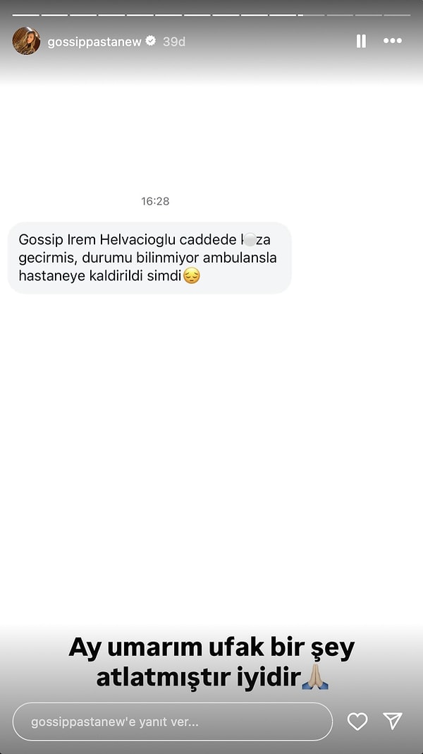 Gossippasta hesabı, kendisine gelen bildirileri paylaşarak İrem Helvacıoğlu’nun kaza geçirdiği tezini duyurdu.