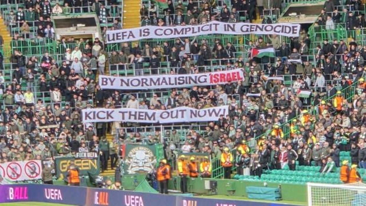 Celticli taraftarların açtıkları pankartlarda “UEFA, israil’i olağanlaştırarak soykırıma ortak oluyor.” ve “Onları çabucak atın.” bildirileri yer aldı.
