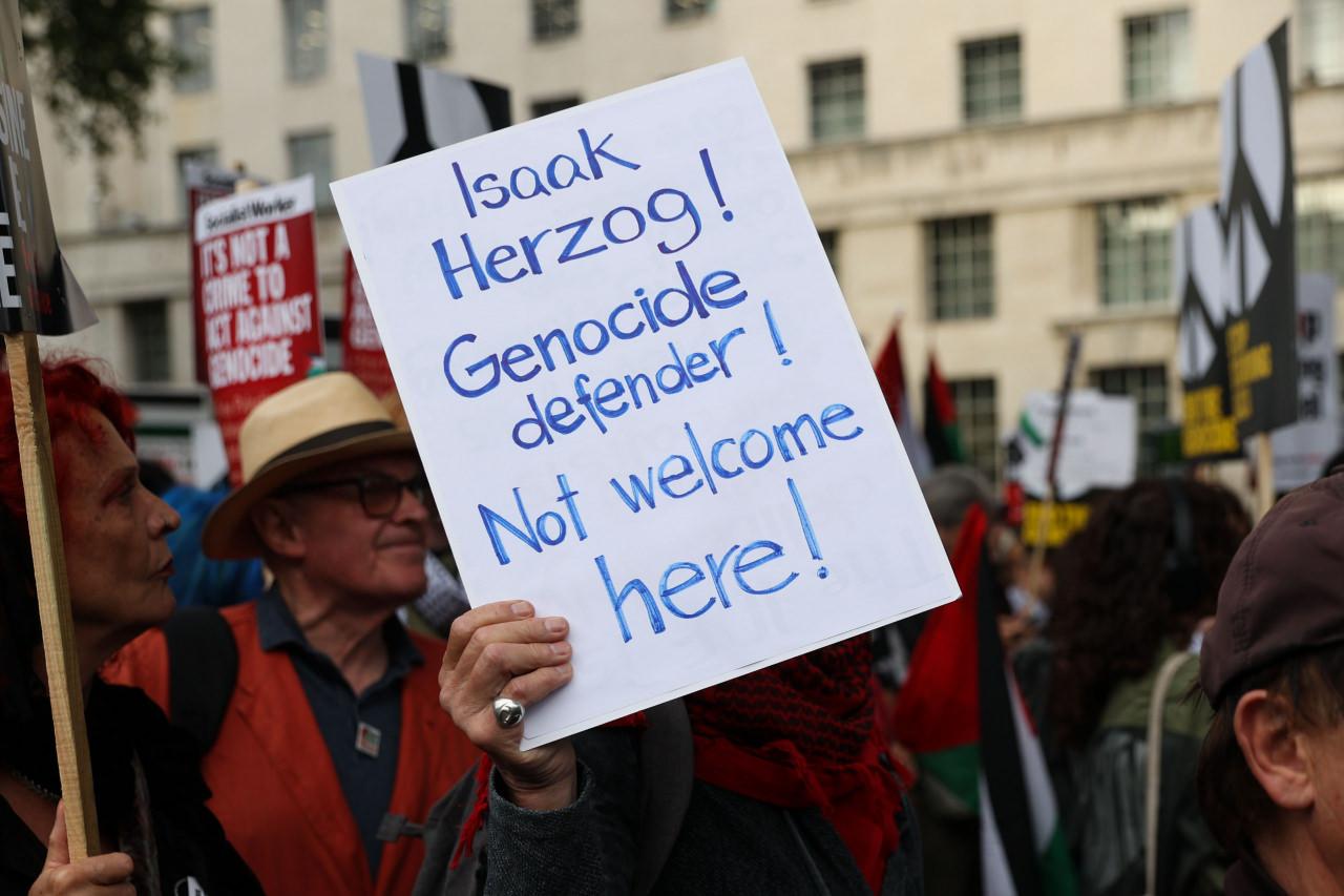 İsrail’in Gazze hücumlarına ve İngiltere’nin İsrail’e silah satışlarına reaksiyon gösteren aksiyoncular, “Soykırım savunucusu Herzog“, “Herzog, savaş cürümlerinden ötürü tutuklanmalı” ve “Herzog savaş suçlusu” pankartları taşıdı.